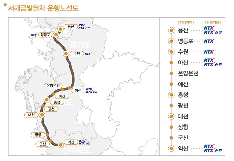 용산→ 영등포→수원 →아산→온양온천→예산→홍성→광천→대천→장항→군산 →익산